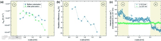 图4 对条纹电极极化实验(3V,400℃设定温度)影响的局部解决调查。(a)通过微电极EIS测量探测实验前后的局部电导率,(b)单个电极的相对电导率变化,以及(c)通过LIBS测量的电极上和电极之间的化学分析。结果显示,电极之间的电导率行为发生了明显的变化,以及电极上强烈的Li 计量变化,证实发生了电化学反应。