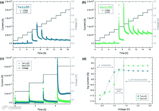 图7 逐步增加电压的金微电极的极化(0.2V的步长,1.4小时的保持时间,350℃的设定温度,100微米的电极直径)。(a)Ta:LLZO和(b)Ga:LLZO单晶的电流时间曲线,以及(c)最低电压的放大图和(d)每个电压步长结束时的 "稳定 "电流,以对数尺度绘制。在增加到1.2-1.4V后,测量的电流在更高的电压下保持不变,表明在这个范围内有一个与电压无关的分解反应。