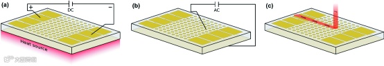 图2 带状电极的极化实验示意图。(a) 通过两个相对的宏观金电极施加场应力,(b) 通过微电极EIS测量进行横向分辨电导率测定,(c) 通过LIBS线扫描分析进行横向分辨化学分析。