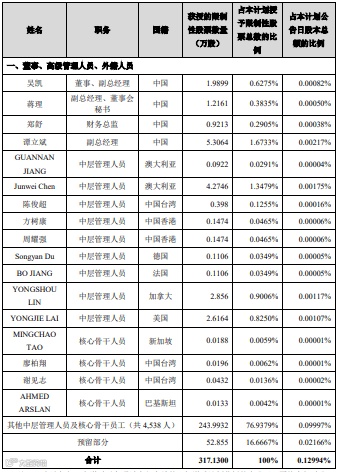 宁德时代副总经理谭立斌获授的限制性股票数量最多,为5.31万股,占本计划授予限制性股票总数的1.67%。其次为中层管理人员Junwei Chen,获授限制性股票4.27万股。