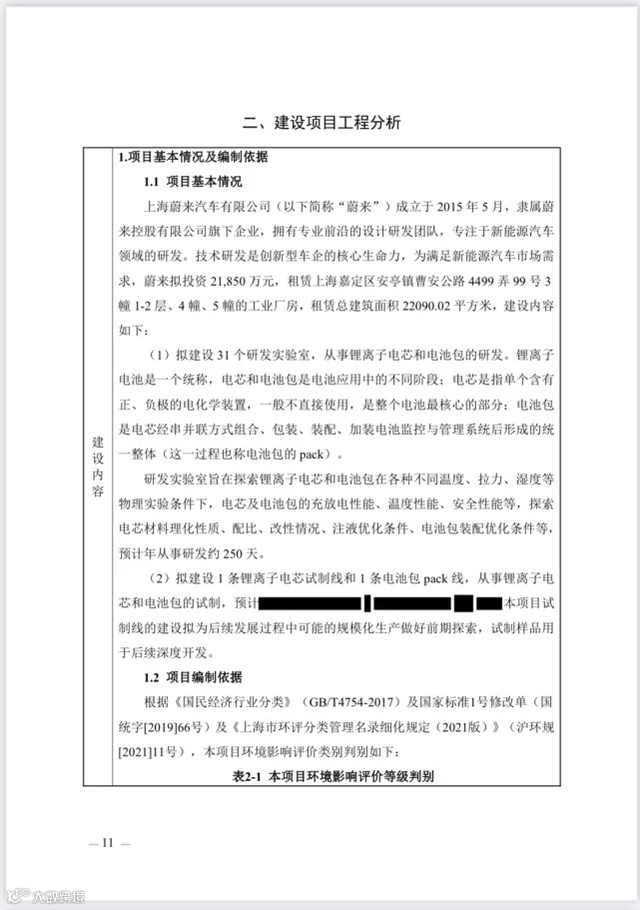 根据蔚来汽车提交的环评报告显示,将租赁上海市嘉定区安亭镇曹安公路4499弄99号3 幢1-2 层、4 幢、5 幢,租赁总建筑面积22090.02 平方米。从事锂离子电芯和电池包研发的31个研发实验室,以及1条锂离子电芯试制线和1条电池包pack线,拟投资2.19亿元,预计今年8月至10月期间施工。