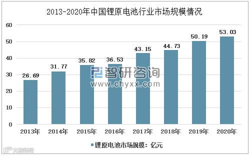 据智研咨询,2013年我国锂原电池市场规模为26.69亿元,2020年达到53.03亿元。与此同时,随着手机、电脑等电子设备的高速发展和新能源产业的推进,锂离子电池产业进入了一个新的发展时期,2013年市场规模已达到596亿元,2020年时已经逼近2000亿元规模。