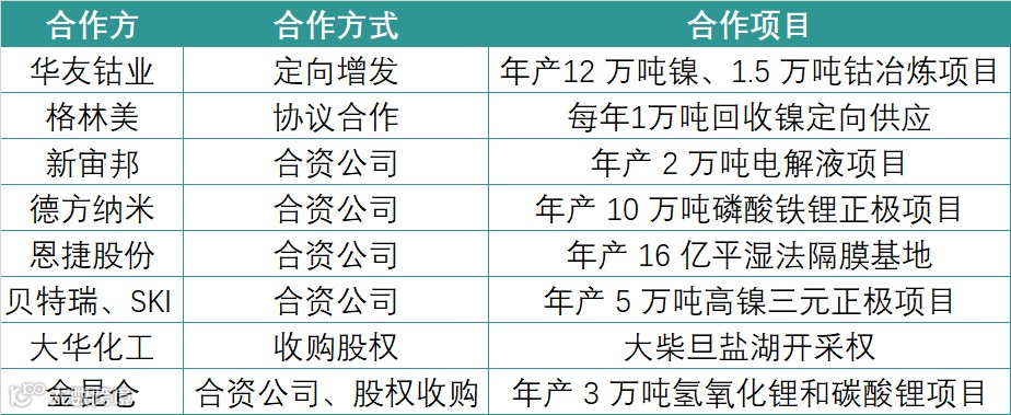 2021年,它先后与华友钴业、格林美、新宙邦、贝特瑞、德方纳米、恩捷股份等上游知名企业合作,以成立合资公司、收购股权、参与定增等方式,共同建设上游资源项目。