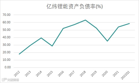 随着向动力电池领域的持续布局,亿纬锂能的负债率开始飙升,在2018年升至63%,尽管2020年一度出现好转,但去年又再次升高,今年一季度达到了58.58%。