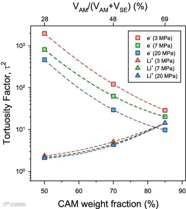 图12. 由NCM88和LPSCl以50:50、70:30和85:15的重量比混合制备的复合电极的e-和Li+电导率的曲率因子(τ2)。