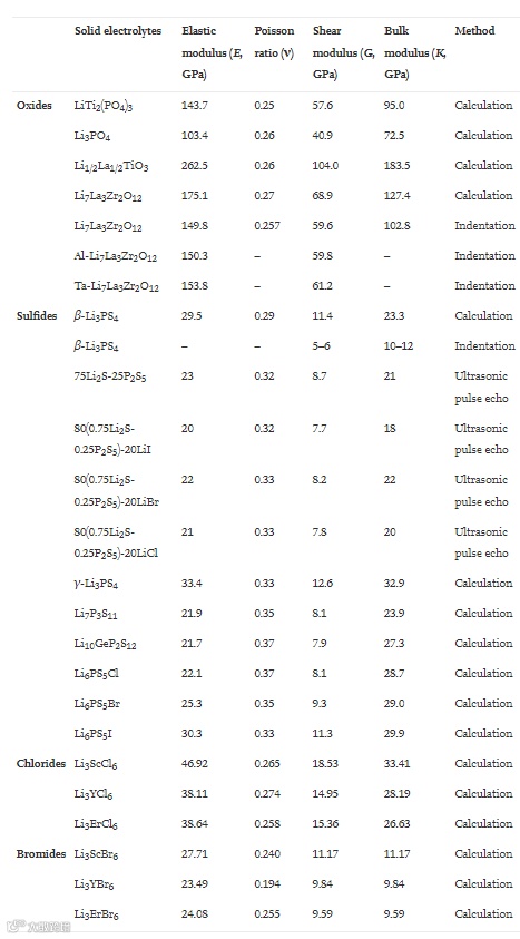 主要无机SE的机械参数列于表1。相比其他化合物,氧化物具有脆性。然而,例外的是,几种玻璃氧化物SE可以通过冷压变形,与CAMs形成二维(2D)接触(90Li3BO3-10Li2SO4:1.0 × 10-5 S cm-1 和42Li2SO4-28Li2CO3-30LiI:5.9 × 10-6 S cm-1/25℃)。由于其低弹性模量值,硫化物SE被认为是最具延展性的无机SE之一(例如,β-Li3PS4:29.5 GPa ,75Li2S-25P2S5:23 GPa,Li7P3S11:21.9 GPa,以及Li6PS5Cl:22.1 GPa )。特别的,众所周知,玻璃形态的硫化物SE比它们的晶体对应物更容易变形。Li2S-25P2S5玻璃在容纳较软的I-和Br-离子时变得更软。这是因为纳入较大的阴离子后,离子堆积密度降低,晶格极化性增。新出现的卤化物SE是另一类延展性SE。最近的DFT计算表明,氯化物SEs的变形能力不如硫化物,但溴化物SEs显示出相当的变形能力。