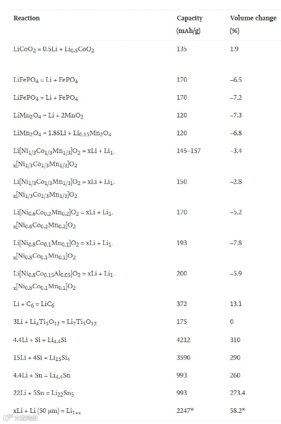 表2. 锂电池活性材料的反应方程及相应的理论容量和体积变化。