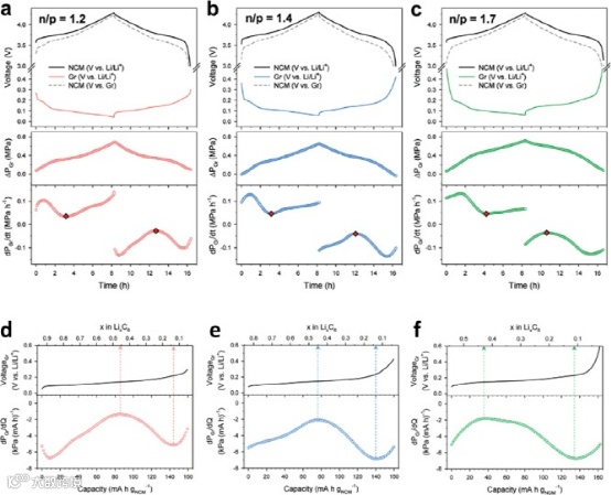 循环时对ΔPstack的检测可以用来诊断全电池的SOC状态。Jung和他的同事证明了操作性DEP可以精确估计NCM|石墨全电池的SOC。为了验证将堆积压力的变化转化为SOC,操作人员的负载测量系统与全固态三电极电池相结合。图11a-c显示了不同n/p比的NCM|石墨电池的电压曲线和压力变化(ΔPGr)。ΔPGr是通过从NCM|Gr电池的压力变化中减去NCM|LTO电池的压力变化来估计的(ΔPGr = ΔPNCM|Gr-ΔPNCM|LTO)。在充电过程中,图11a-c中每个n/p比率的dPGr/dt对时间曲线的局部最小点由红色标记表示。在放电过程中也观察到奇异的点,作为DEP图中的局部最大值。值得注意的是,随着n/p比率的增加,局部最小点在x轴上发生了正移,反映了更大的初始不可逆能力。相反,局部最小和最大点可以作为跟踪SOC的里程碑,这一点通过将实际SOC与这些奇异点相匹配而得到验证(图11d-f)。这种非破坏性的诊断技术可能有利于ASSB实用电池管理系统的开发。