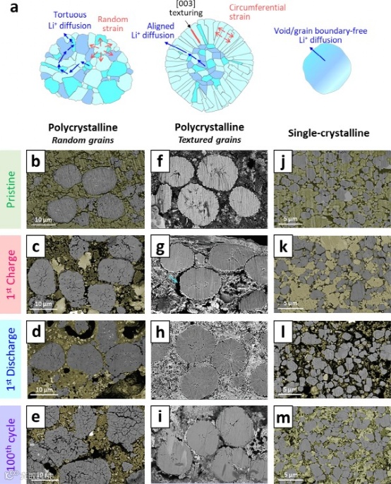 图5. (a) 微结构形态示意图,显示了具有随机取向晶粒的多晶CAM颗粒、纹理(径向取向的棒状)晶粒和单晶CAM颗粒产生的局部应力方向和Li+扩散途径。