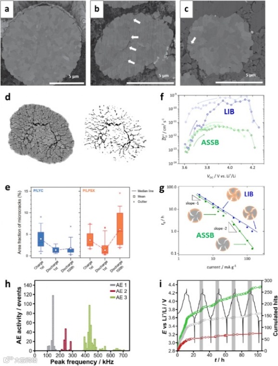 图4. 多晶体NCM颗粒在(a)原始状态、(b)用LE充电后和(c)用SE充电后的横截面图像。(d) 用于量化CAM裂纹的示例性图像处理;(e) 其结果是比较使用硫化物SE和氯化物SE的CAM。(f) 在半无限边界条件下由GITT测得的表观Li+扩散系数。(g) 比较LIB和ASSB的放电时间(td)和静电放电电流图。(h) 在LIB的前五个周期中测量的累积声发射(AE)活动。(i) 不同频段的电池电压和相应的累积点击率。