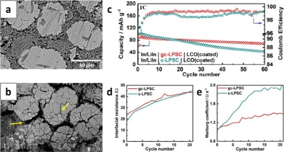 LE的流动可以跟上CAM的体积变化,从而保持CAM/电解质的接触。相反,由于SE的非弹性特征,CAM/SE接触在循环时被严重损坏。特别是,在充电过程中,有大量的CAM/SE脱落,在此期间,CAMs的晶格体积收缩。图7a和b显示了NCM复合电极在初始充电(脱锂)之前和之后的横截面扫描电子显微镜(SEM)图像。除了CAM的内部开裂外,还观察到CAM和SE的严重脱层。这种脱层减少了离子接触面积,最终导致离子隔离的CAM颗粒,这大大加剧了ASSB的速率能力和循环保持能力。