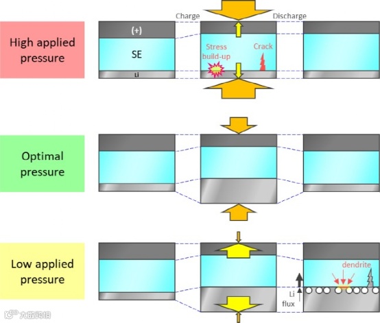 当没有施加外部压力时,阴极和金属锂被允许轻易地膨胀,并且在充电时堆叠的总体积可以自由增加(图9)。因此,只有可忽略不计的内部应力会被建立起来。然而,在这种低工作压力下,阴极中的CAM/CAM(用于e-传输)和CAM/SE(用于Li+传输)粒子间的接触很容易松动,这增加了电极电阻。此外,由于金属锂的塑性变形率降低,Li|SE的界面面积也明显减少。