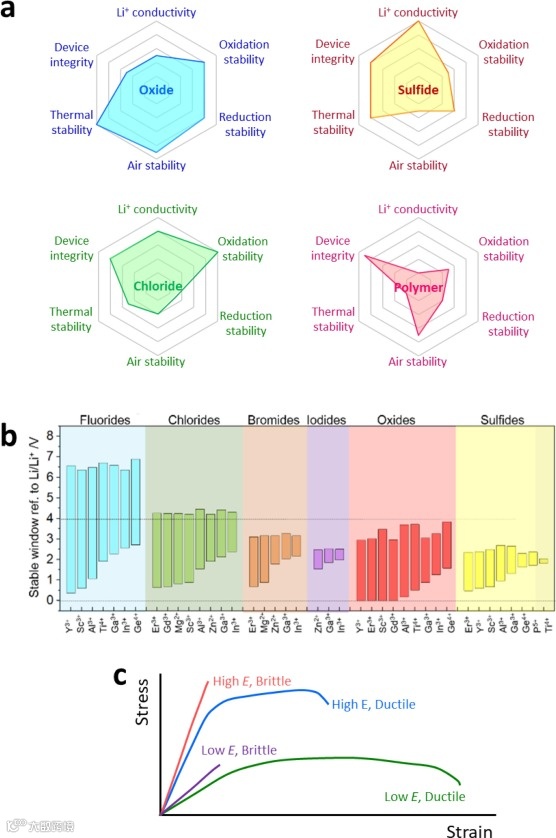 图2. (a) 各种SE化合物关于ASSB应用要求的比较。(b) 无机SE的电化学稳定性窗口的比较。上限和下限电位是通过DFT计算估计的。(c) 脆性和韧性材料的典型应力-应变曲线。
