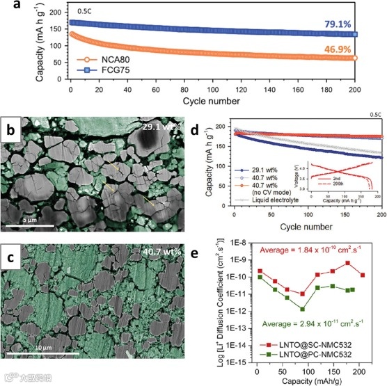 图6. (a) 使用具有随机取向和纹理的多晶CAM颗粒的ASSB的循环性能。. 使用Li3YCl6作为SE的复合电极的横截面SEM图像,其重量分数为(b)29.1%和(c)40.7%,以及(d)其相应的循环性能与LE电池的比较。(e) 使用单晶和多晶CAM的复合电极的表观Li+扩散系数的比较。
