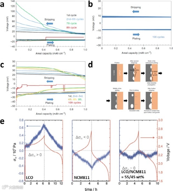 图10. 不同电流密度和压力,使用三电极电池测量的金属锂重复电镀/剥离的电压曲线。(d) Li|Li6PS5Cl界面的示意图,在整体电流密度高于临界电流密度的情况下进行循环。(e) CAM|SE|Li4Ti5O12电池使用LiCoO2、NCM811以及LiCoO2和NCM811混合物的堆压变化比较。