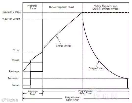 对于电压过低的电池需要进行预充,电池电压低于2.5V(Vshort)时,锂离子电池充电器用25mA的电流预充,防止深度放电的锂离子电池在快充时被损坏甚至发生危险。