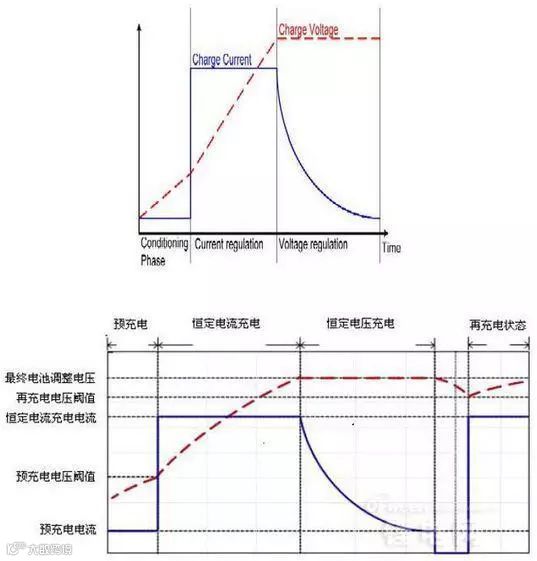 锂离子电池的充电过程可以分为四个阶段:涓流充电(低压预充)、恒流充电、恒压充电以及充电终止。