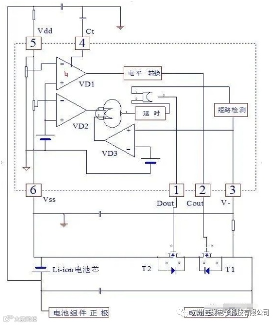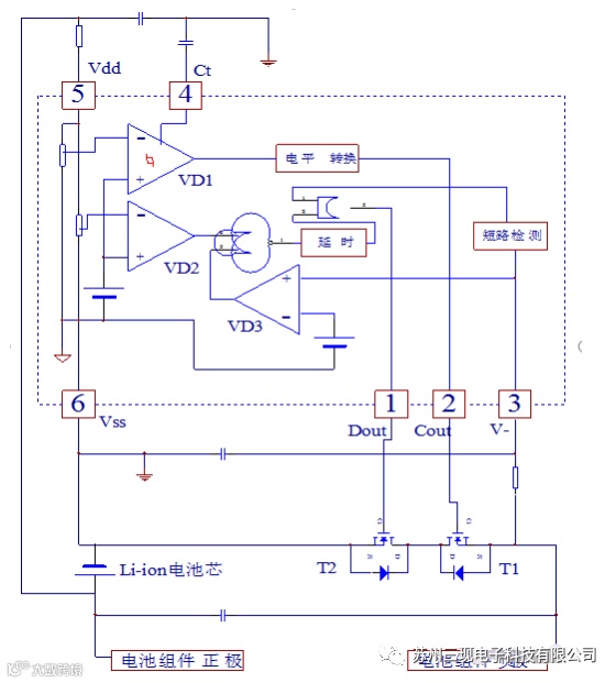 当电池电压因放电而降低至设定值VD(2.3-2.5V)时, VD2翻转,以IC内部固定的短时间延时后,使Dout变为低电平,T2截止,放电停止。