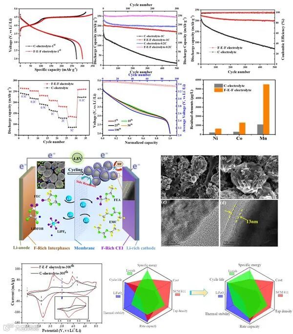 富锂锰基正极材料因其高比容量、高能量密度、低成本等优点,非常适合用于新一代高能量密度锂离子动力电池。但是其材料自身低首效、循环及倍率性能差、电压衰降严重的本征缺陷,以及缺乏相匹配高压电解液等问题制约了商业化应用和发展。研究团队独辟蹊径,通过电解液一步法原位改性,成功开发出一种全性能富锂锰基电池体系相关研究,结果发表在《应用材料与界面》(ACS Applied Materials & Interfaces)。通过SEM/TEM/XPS/ICP-AES等一系列测试,证实在正负极表面原位包覆形成了含氟的坚固致密CEI保护膜,既稳定了正极材料结构,又抑制了电解液分解对正极材料造成的腐蚀,有效减少了金属离子的溶出,从而大幅提升富锂锰基正极材料的综合电化学性能。改性后的富锂正极材料首次放电比容量达到300mAh·g-1,在0.5C倍率下经过500次充放电循环后容量保持率高达88%。同时,电池循环过程中的电压衰降也得到很好的改善。