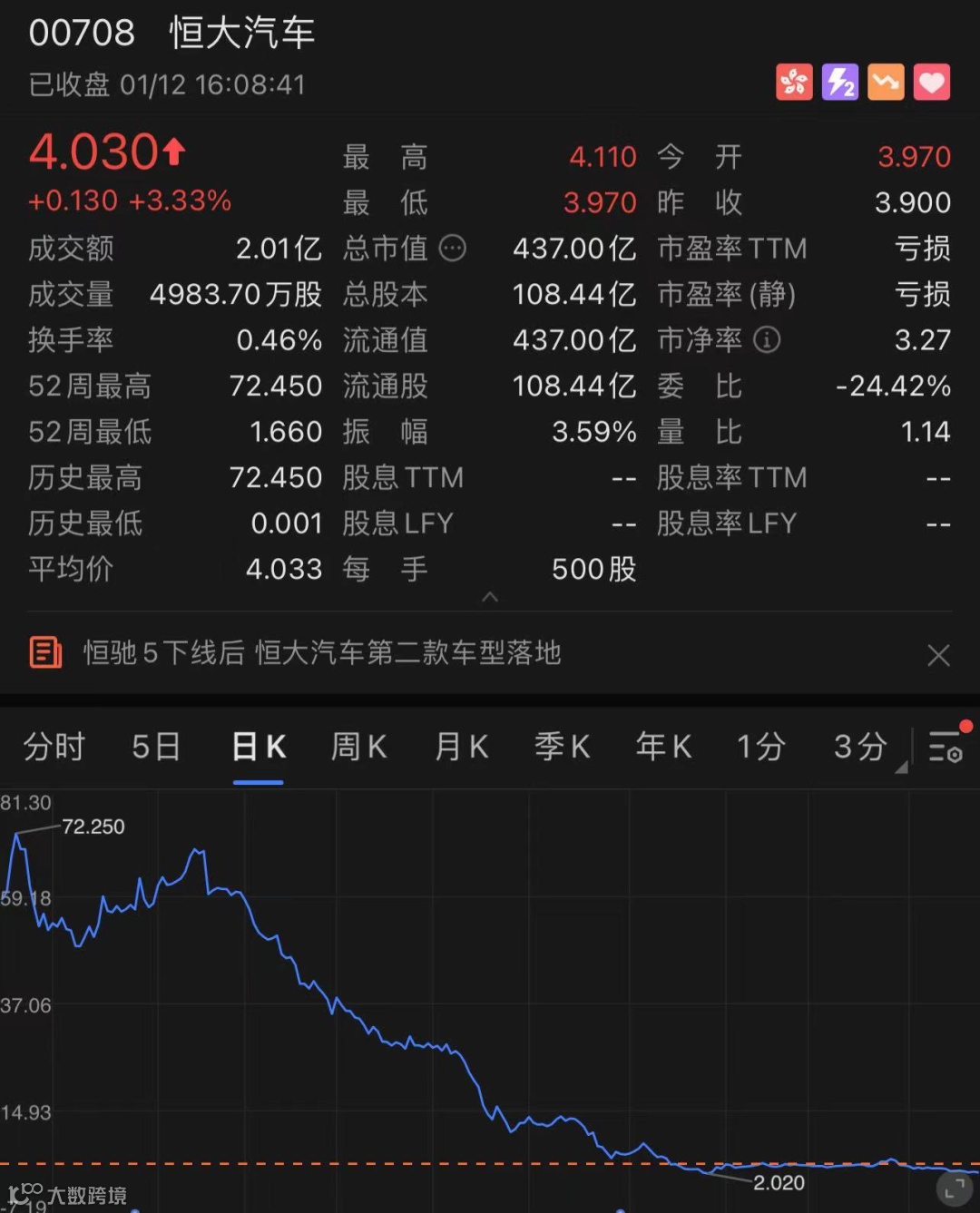 截至1月12日收盘,恒大汽车港股报收4.03港元,收涨3.33%,最新市值为437亿港元。纵观2021年,恒大汽车股价经历了大起大落,较2021年最高点跌超90%。
