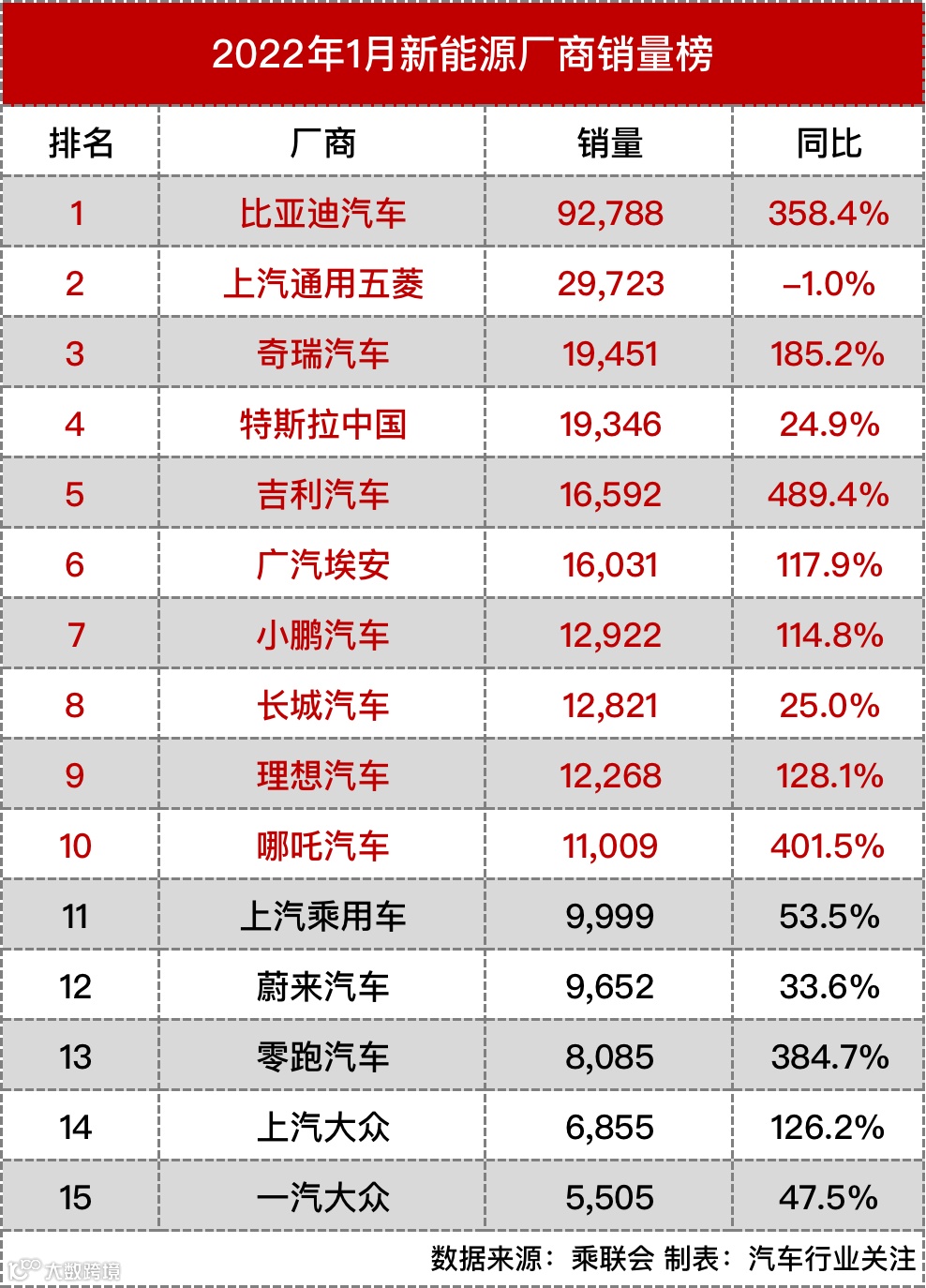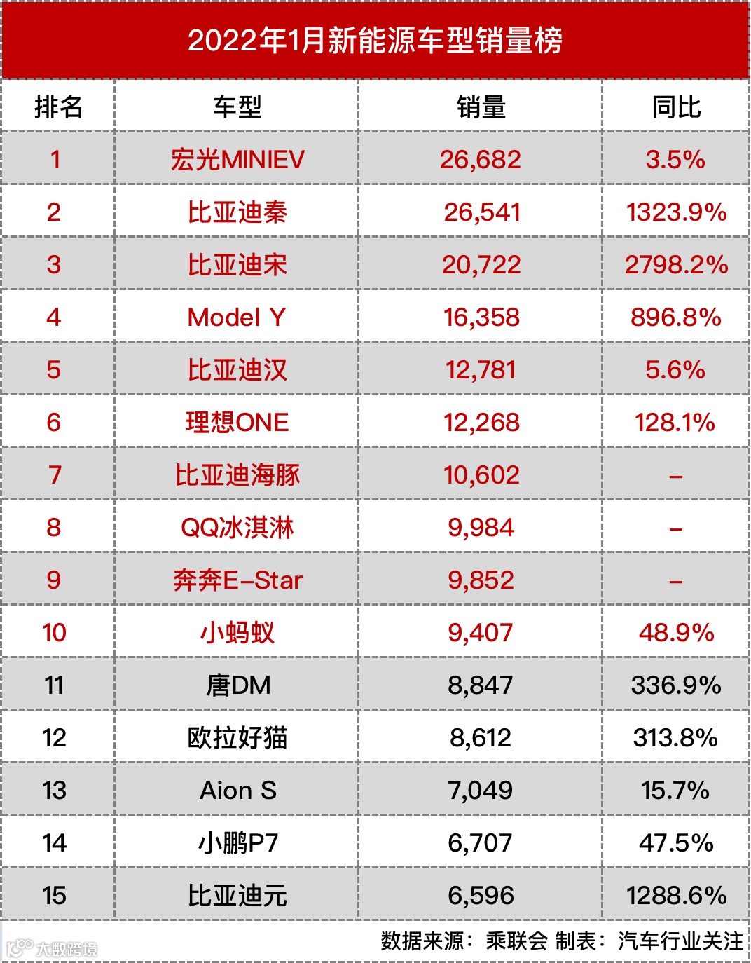 具体车型方面,宏光MINIEV仍然是销冠,其以26682辆的成绩领先一众车企,虽然同比增长3.5%,但是对比2021年各月还是不够给力,这也导致上汽通用五菱出现了1.0%的跌幅,成为榜单中唯一下滑的车企。在榜单中,我们同样可以看到不少微型车,例如奇瑞小蚂蚁、长安奔奔E-Star、QQ冰淇淋等,其中QQ冰淇淋成为“黑马”,首月就拿下了9984辆的成绩,未来可能成为宏光MINIEV的威胁。
