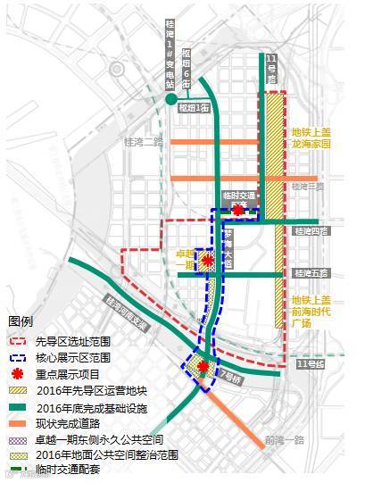 为了尽早展示自贸新城新形象、新魅力,前海合作区打造以桂湾片区五单元、二单元等重点,包含前海车辆段上盖物业项目、卓越项目、华润项目及市政道路、园林绿化、指示标牌、城市家私等,总建筑面积284万平方米的金融先导区,从建筑、园林景观、绿化小品、城市雕塑、公共设施、交通组织等方面进行系统性设计和精致施工,力争在2016年12月、2017年6月、12月等多个重要时间节点,分层次展示国际一流的城市品质,城市形象和活力都市。