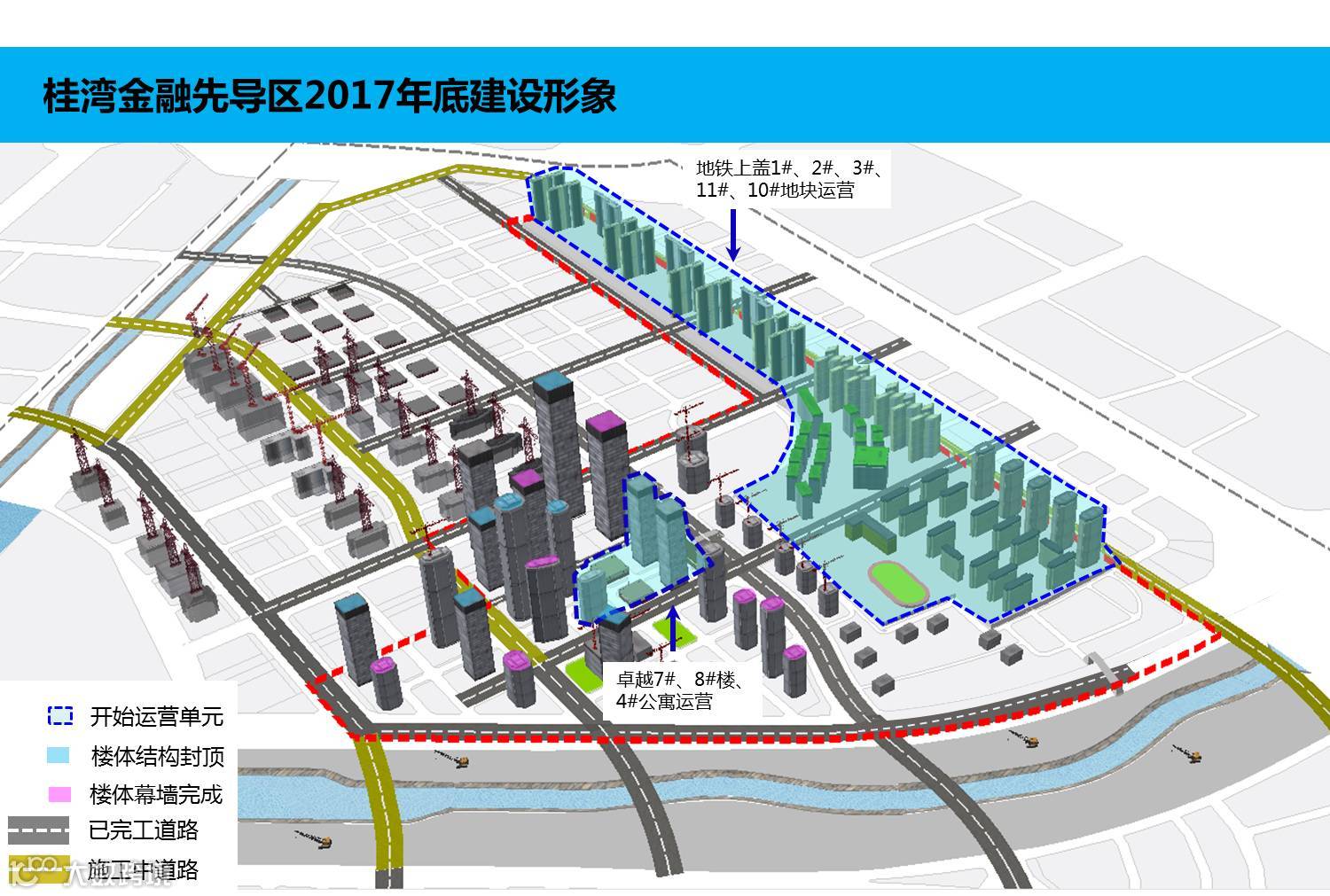 截止到6月底,桂湾金融先导区按计划推进。卓越金融中心一期完成部分验收工作,预计9月30日可以入伙,可提供办公面积14.4万㎡。卓越二期02栋主体结构施工至35层,北侧1号塔楼完成桩基础检测,开始底板施工。