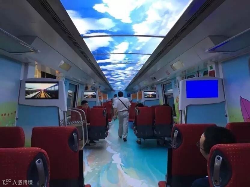 传说中的蓝天白云车厢顶,有种 " 敞篷 " 列车的即视感。