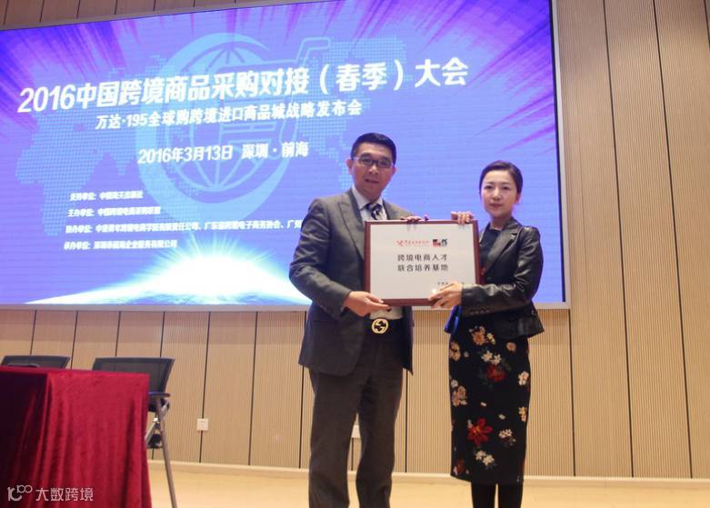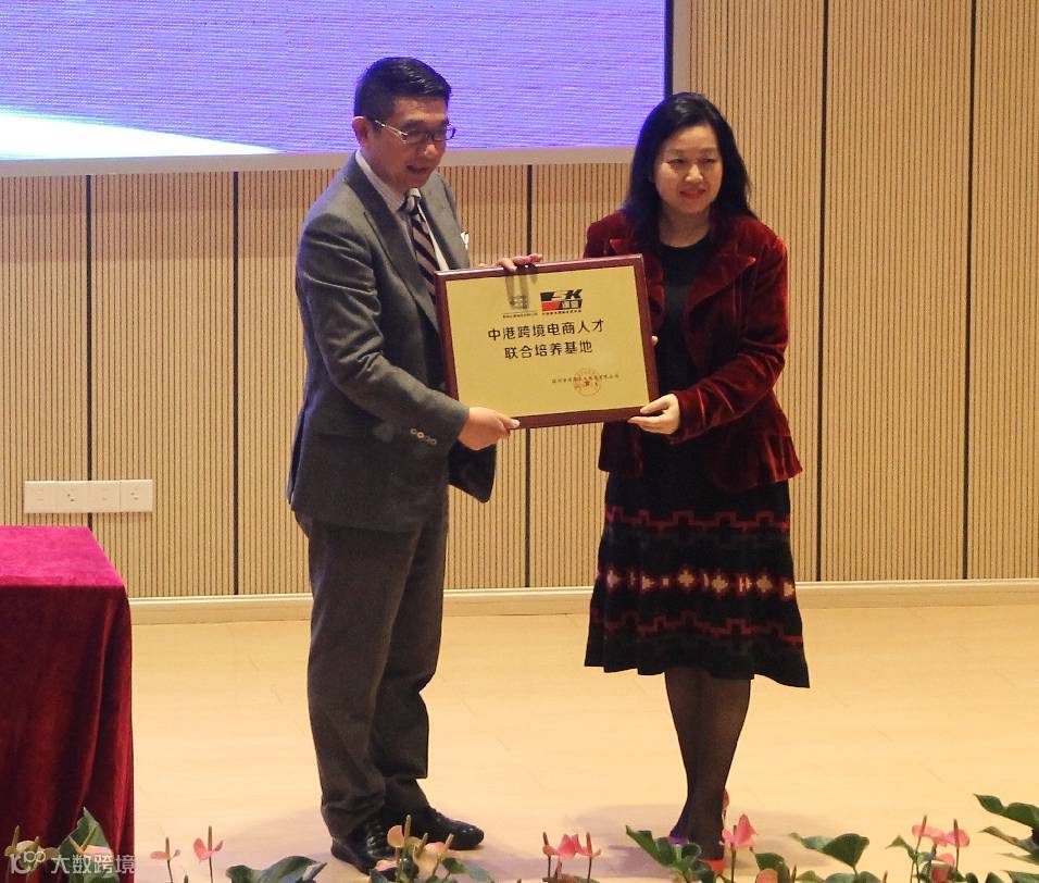 会上,深圳市前海企业服务有限公司副董事长、总经理孙飞女士为中国跨境电商采购联盟、中港青年跨境电商学院颁发“中港跨境电商人才联合培养基地”授牌。