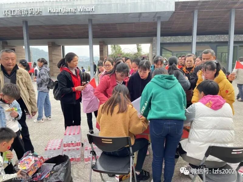 早上9点,职工们于环江旅游码头排队签到领取礼品兑换券,随后整装待发开始徒步。