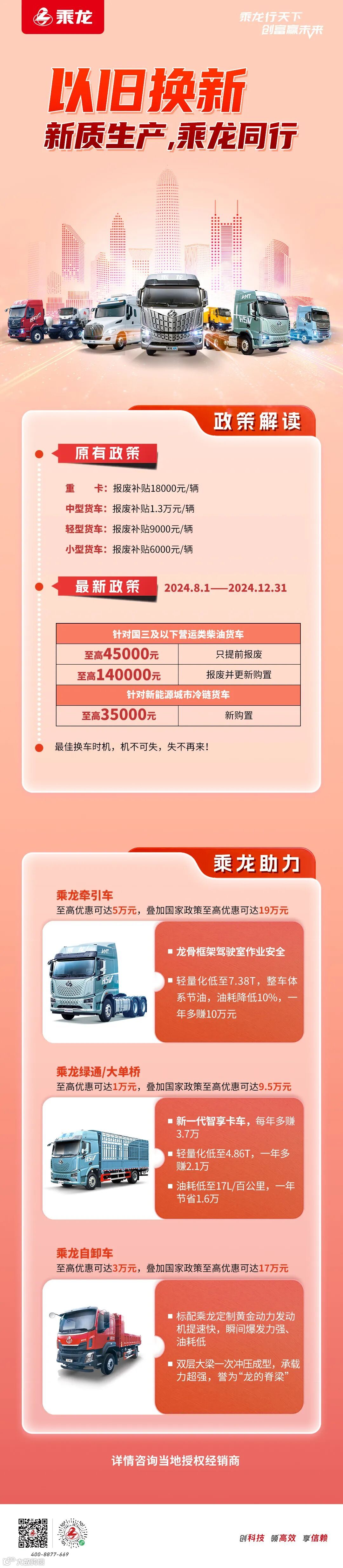 乘龙H5 270马力大单桥,“快”领未来,“大”不一样!正值乘龙以旧换新季,置换乘龙大单桥还能领取国家与乘龙双重置换补贴,快和乘龙H5 270马力大单桥一起踏上运输路,开启致富新篇吧!