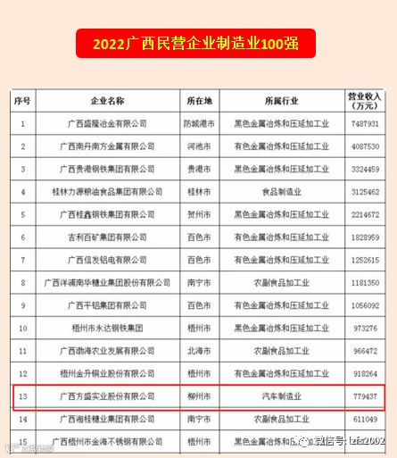 我集团公司已连续多年位列“广西民营企业100强”,本次评选,柳州市入围“2022广西民营企业100强”的单位共11家,我司排名第二,并在入选的12家制造业行业单位中排名第一。