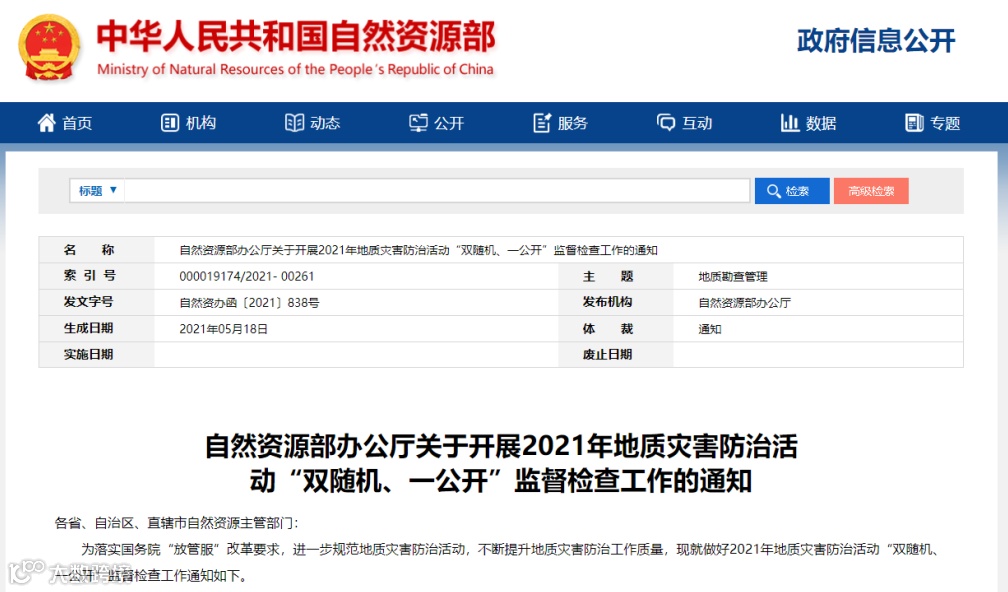 根据《自然资源部办公厅关于开展2021年地质灾害防治活动“双随机、一公开”监督检查工作的通知》(自然资办函[2021]838号)的要求,西南大地集团被列为2021年度地灾资质监督检查单位。接到通知后,西南大地集团严格按照相关要求准备检查资料,积极配合省自然资源厅检查。