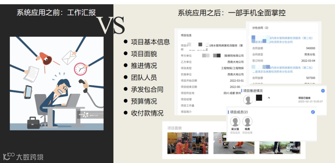我国地勘行业项目管理信息化程度普遍较低,项目治理水平不高,所用的OA系统存在项目信息滞后,无法形成及时、高效的管理能力的问题,仅能满足查询、统计的需求。办公系统、项目管理系统、财务管理系统三者是孤立的,相互之间没有打通数据,项目跑冒滴漏现象严重。