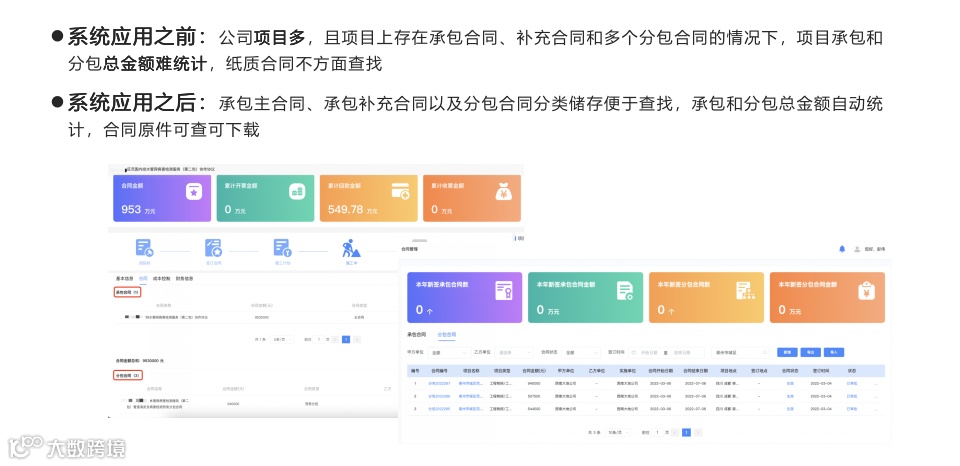 为此西南大地公司科技创新部在2022年2月启动了新项目管理系统开发工作,目标是整合三大系统功能、实时接入财务数据,打造集合同管理、预算管理、收款计划、收款结算、收款开票、付款计划、付款结算、付款收票、付款申请、备用金申请等功能于一体的办公、项目管理、成本管理系统,彻底解决数据孤岛、功能残缺的问题。