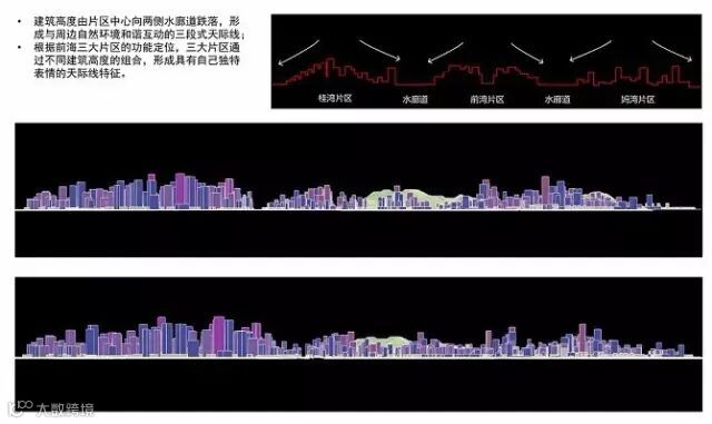 在建筑特色上,建筑高度由片区中心向两侧水廊道跌落,根据前海三大片区的功能定位,三大片区通过不同建筑高度的组合,将形成具有自己独特表情的天际线特征。“构成前海天际线的建筑单体设计要体现地域性、文化性、时代性的和谐统一,形成由以现代主义为主的多元建筑风格组成的天际线。”