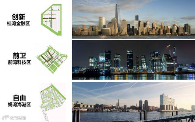 根据规划,前海将打造分别以“创新”“前卫”和“自由”为特征的桂湾金融区、前湾科技区和妈湾海港区三大特色开放街区。在城市风貌上,通过线性公园、绿化带以及绿色阳台,塑造立体线性绿道网络。绿道网络高密度地植入建筑之中,“保证每一地块至少有一面临靠绿地”。对点状绿地、轨道站点周边的绿地进行精细化处理,形成大大小小的口袋公园。