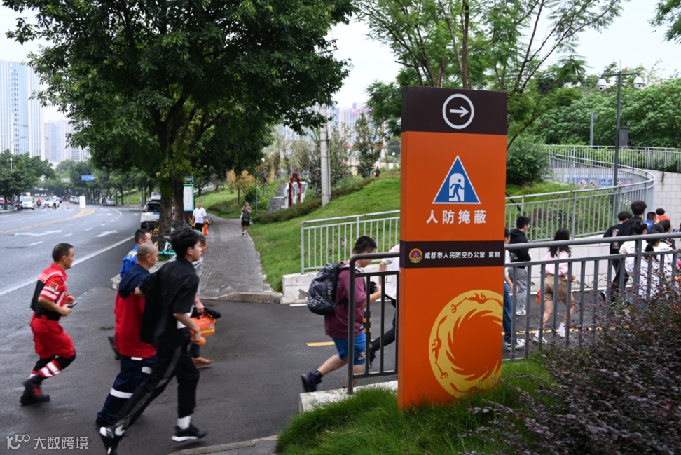 上午10时整,防空警报拉响,劼人公园附近小区内的居民,在应急救援队员、公安人员的组织下,从小区内跑出,过马路后,分别向地铁站内、劼人公园下的人防隐蔽区域跑去。