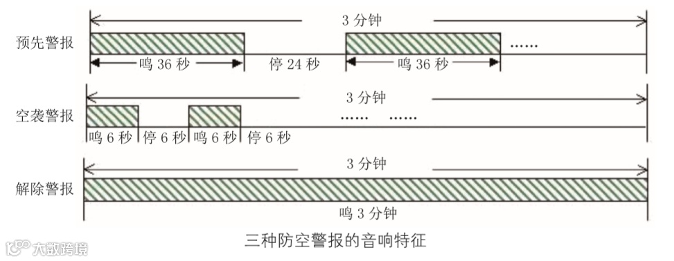 空袭警报信号规定:鸣6秒,停6秒,反复15遍为一个周期,时间3分钟,特点是“短间隔”。