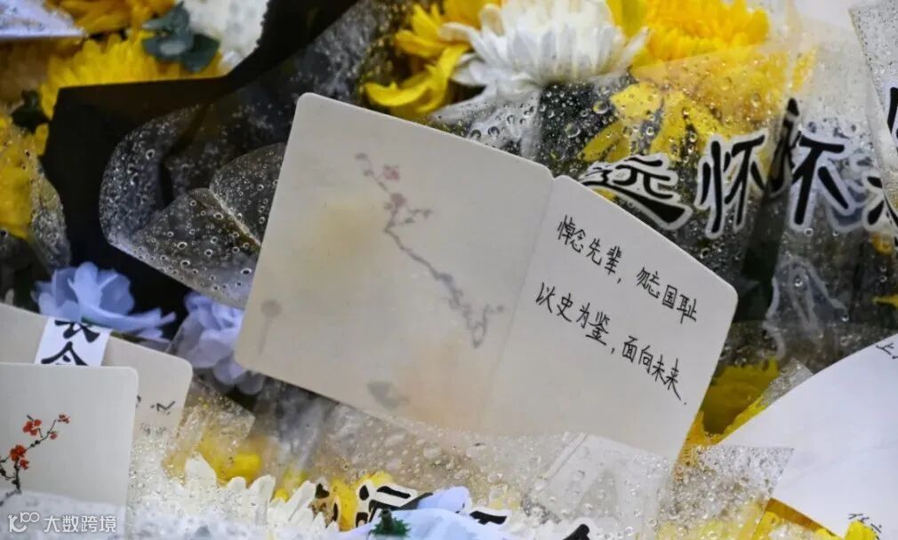 纪念碑前摆满了菊花,一个个手写卡片别在花前,“百年回眸,山河无恙,忠魂陨落,浩气长存。”“灵魂铸就的不朽,让我们为一个个不曾远去的名字,肃穆!”