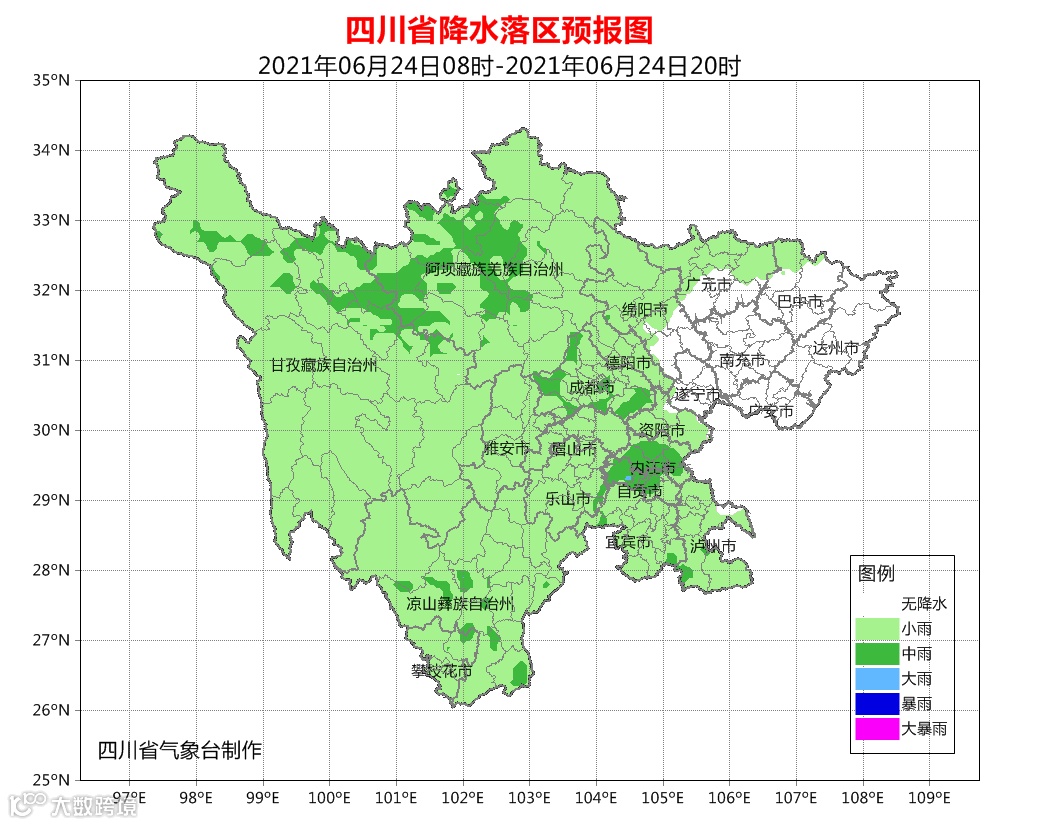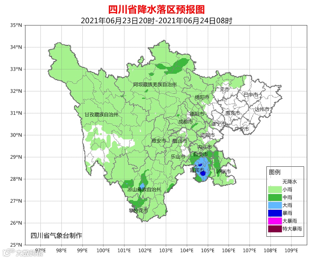 巴中、达州、南充、广安、遂宁5市阴天间多云,盆地其余各市阴天有阵雨或雷雨,部分地方有中雨,其中宜宾市有大雨,局部暴雨;川西高原北部和攀西地区阴天间多云有阵雨或雷雨,其中阿坝州大部、甘孜州北部及攀西地区中部有中雨,局部大雨。