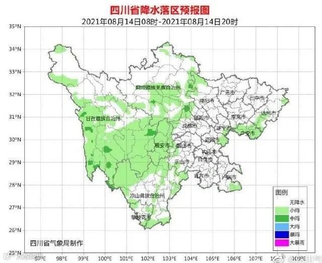 南部及盆地西部沿山阴天有分散阵雨;川西高原北部多云间阴有阵雨或雷雨,川西高原其余地方和攀西地区阴天有阵雨或雷雨,雨量普遍小到中雨,其中攀西地区南部的局部地方有大雨到暴雨。