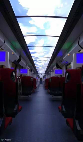 3、车厢顶部是具有蓝天白云效果的顶灯,脚下是泛起点点水花的蓝色地板;