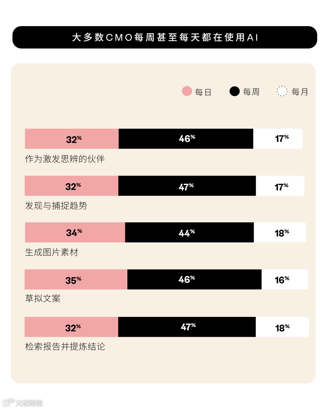 正因如此,CMO们普遍把AI看作提升速度与降低成本的工具,但对其在匠心与创意构思中的角色仍持保留态度:89%认为“生成式AI会大幅提高低成本快速产出素材的能力”,90%认为“生成式AI会使大量营销工作更易于内制化”,91%认为“可以把创意构思交给代理,同时用AI来承担大量本地化改编与再创作”。