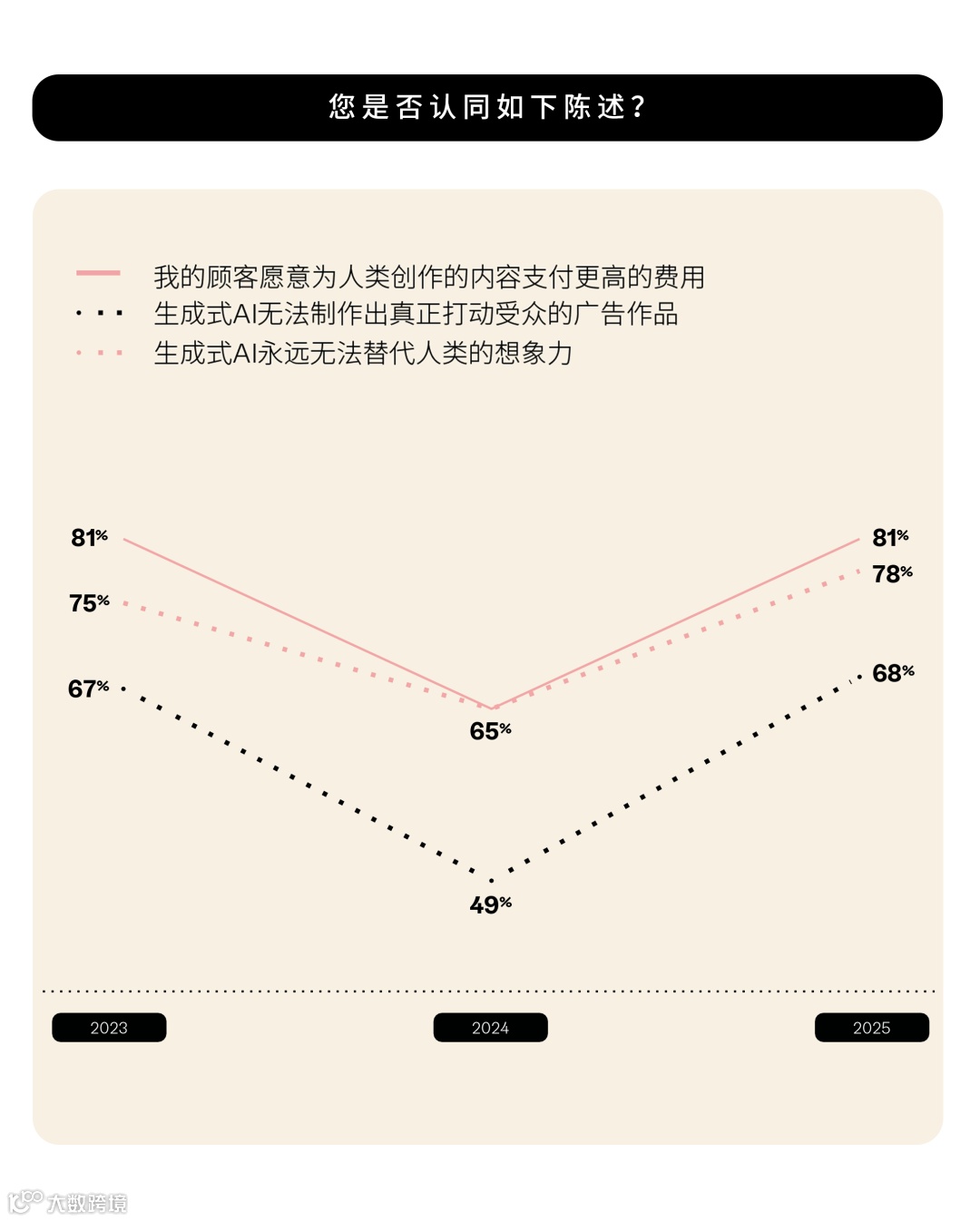 这些变化的原因并非单一。在这样一个变化迅速且充满情感变量的时代,人们的态度会很快转变:2023年技术令人惊艳但仍有明显瑕疵;到2024年,图像等生成内容已达到企业级质量,CMO对技术能做什么更清楚;然而到了2025年,尽管AI生成的影像更光鲜、更流畅,营销从业者开始质疑这些产出是否能在情感层面与人建立真实联结。