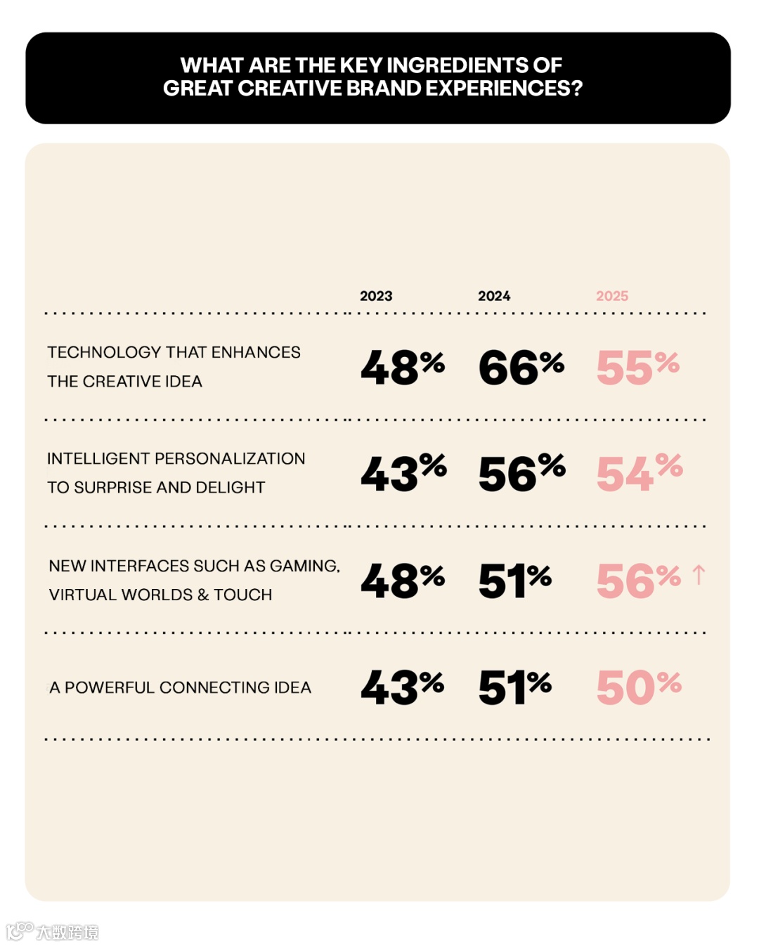 Intelligent personalization and innovative interfaces such as gaming, virtual worlds, gesture and touch are seen as key to delivering creative brand experience, sustaining their importance year on year, and rated as key ingredients by 54% and 56% of CMOs respectively. Meanwhile CMOs plan to use techniques such as immersive AR/VR experiences (49%), integration in gaming (51%) and integration into livestreaming (44%) to innovate around the customer experience.