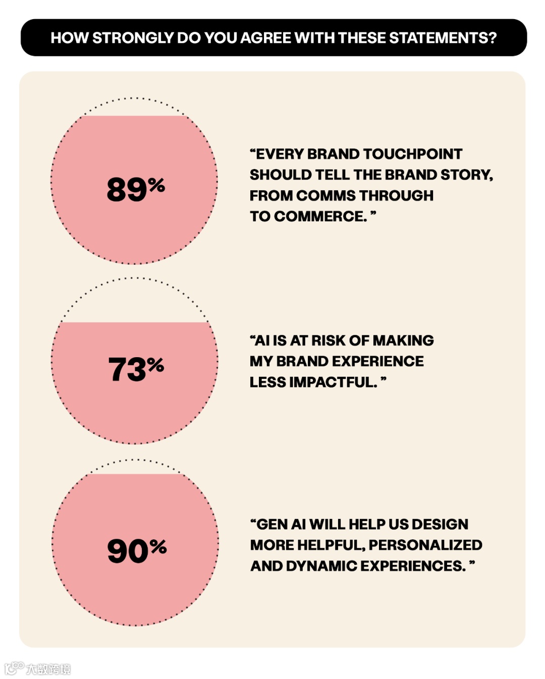 Which is perhaps why 86% of CMOs agree that “Brands today are built through experiences” yet 73% worry that “AI is at risk of making my brand experience less impactful.” On the flipside, 90% agree that “Gen AI will help us design more helpful, personalized and dynamic experiences.”