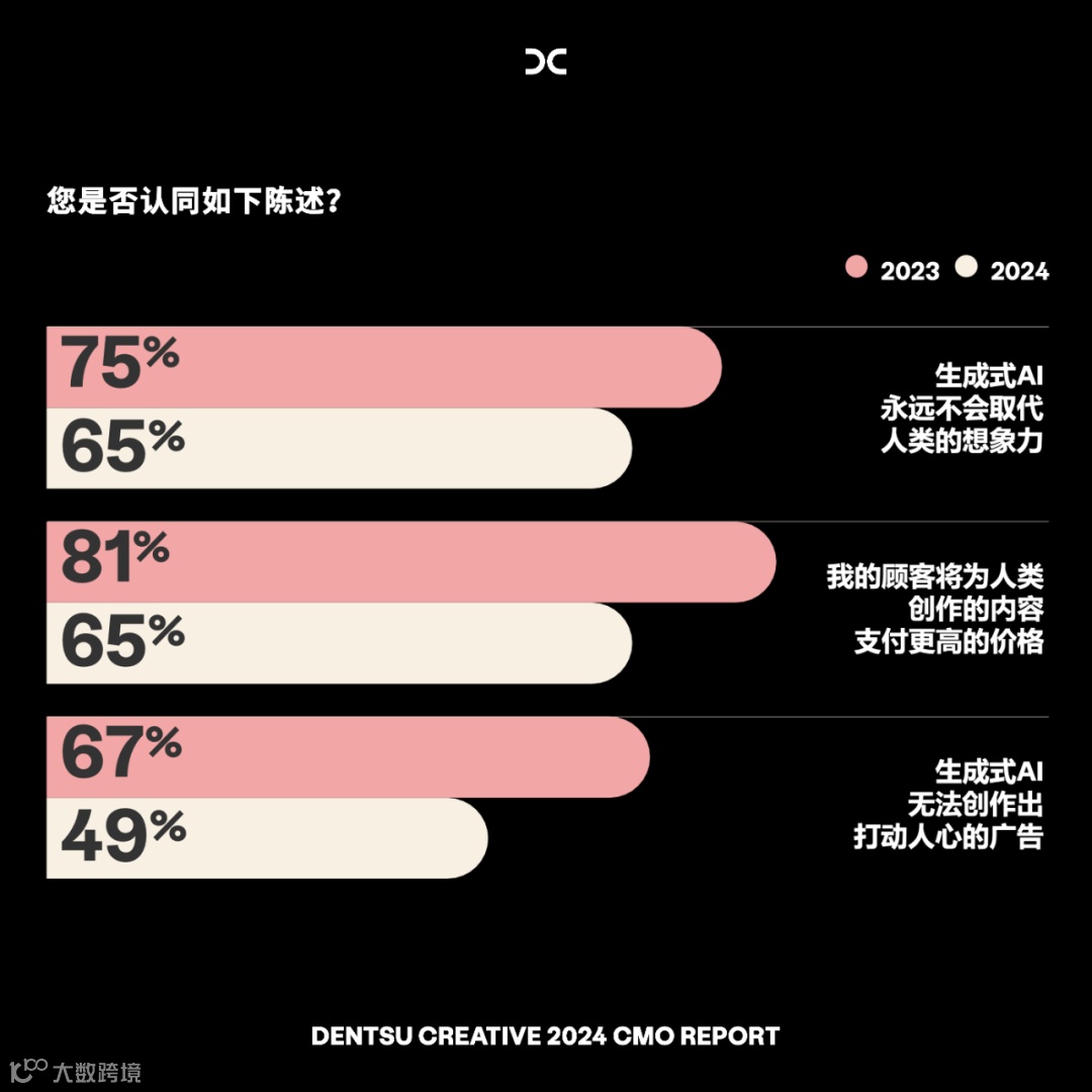 2023年,67%的受访者认为人工智能永远无法创作出真正触动人心的内容。但在今年的调查中,这一比例降至49%。去年81%的受访者认为,顾客乐于为人类创作的内容和体验支付溢价,而在今年,持这一观点的首席营销官比例为65%。营销从业者的态度在短短12个月内发生了巨大转变。