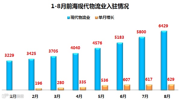最新数据来看,8月前海现代物流业入驻企业新增629家,与7月基本持平。8月物流企业总数达到6429家,极好的反映了前海物流业的快速发展。