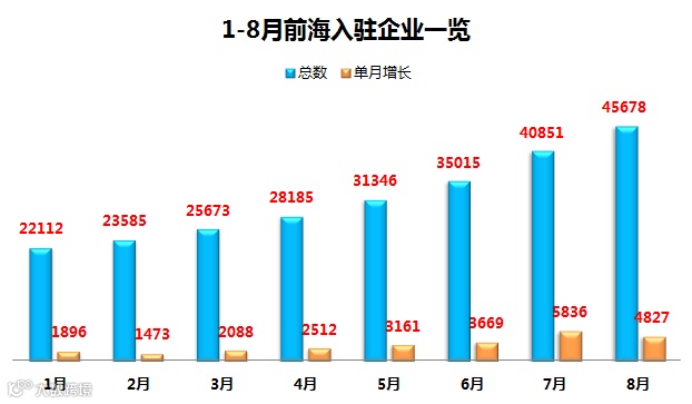 截至8月31日,前海入驻企业总数达到45678家,8月单月增长4827家,较年初(20216家)增长125.9%;其中,注册资金达5亿企业680家,达10亿企业332家,港资背景企业1777家。
